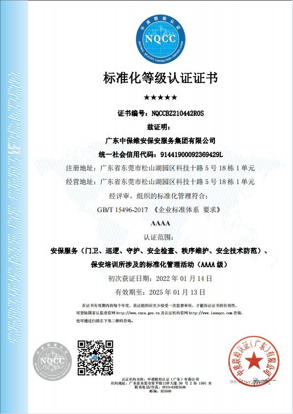 4A標(biāo)準(zhǔn)化等級認(rèn)證證書