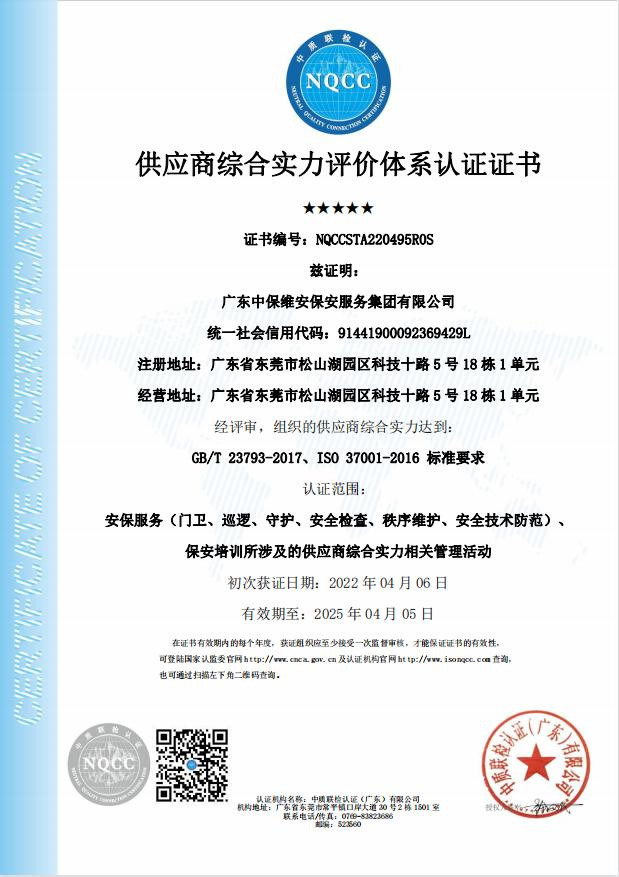 供應(yīng)商綜合實力評價體系認(rèn)證證書
