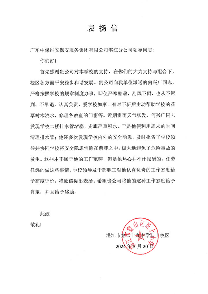首先感謝貴公司對本學(xué)校的支持,在你們的大力支持與配合下,校區(qū)各方面平安穩(wěn)步和諧發(fā)展。貴公司向我單位派送的何興廣同志,嚴格按照學(xué)校的規(guī)章制度辦事,即使嚴寒酷暑,刮風(fēng)下雨,也從不遲到、不早退,認真負責(zé),愛學(xué)校如家。有時下班后主動幫助學(xué)校的花草樹木澆水,修理各教室的門窗等。近期雷雨天氣頻發(fā),何興廣同志發(fā)現(xiàn)學(xué)校二樓排水管堵塞,走廊嚴重積水,于是他便利用周末的時間清理排水管;他還多次發(fā)現(xiàn)學(xué)校內(nèi)外的安全隱患,及時報告了學(xué)校領(lǐng)導(dǎo)并協(xié)同學(xué)校將安全隱患消除在萌芽之中,極大地避免了危險事故的發(fā)生。這些本不屬于他的工作范疇,但是他熱心并不計報酬的,任勞任怨的做這些事情。學(xué)校領(lǐng)導(dǎo)及干部職工對他認真負責(zé)的工作態(tài)度給予高度評價,特致信提出表揚。希望貴公司將他的這種工作態(tài)度給予肯定,并且給予獎勵,